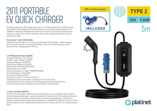 PLATINET 2-IN-1 PORTABLE EV QUICK CHARGER 5M